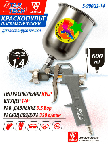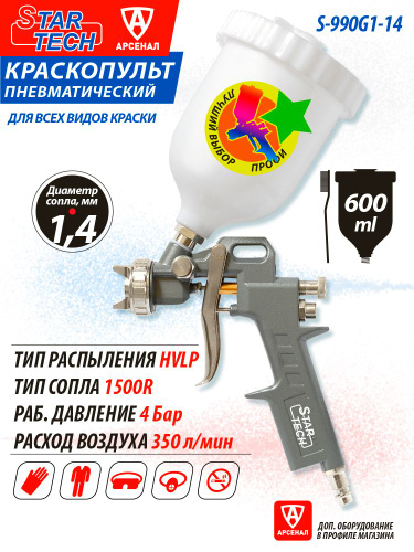 Краскопульт пневматический StarTech (сопло 1,4 мм) верхний пласт. бачок 600 мл, мод. S990G