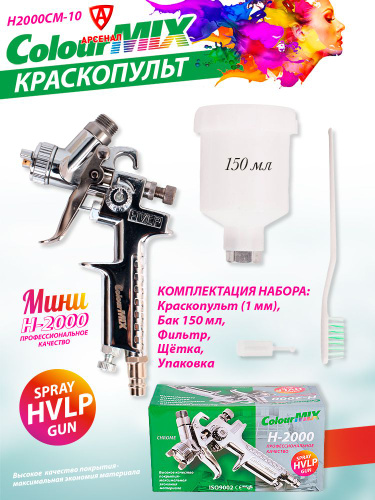 Краскопульт пневматический мини (HVLP, дюза 1.0 мм, бачок 150 мл) ХРОМ; H2000CM-10