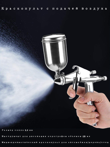 Комплект Краскопульт пневматический (1 шт. + 1 кисть) модель K-3, дюза 0.5мм, для компрессора, капюшон меди, сопло нержавеющей стали, 125мл гравитационная, для покраски авто/дерева/стен