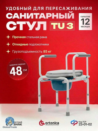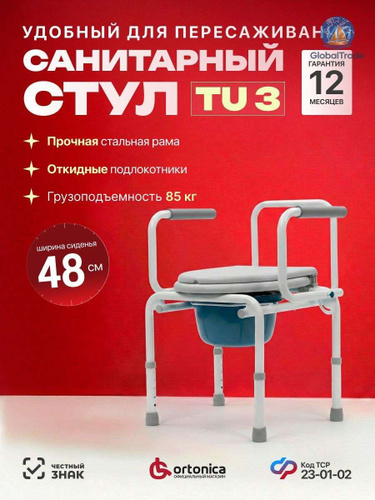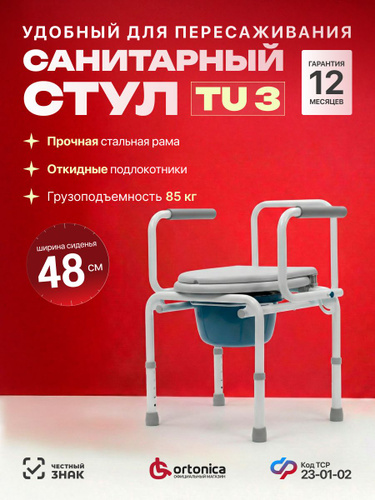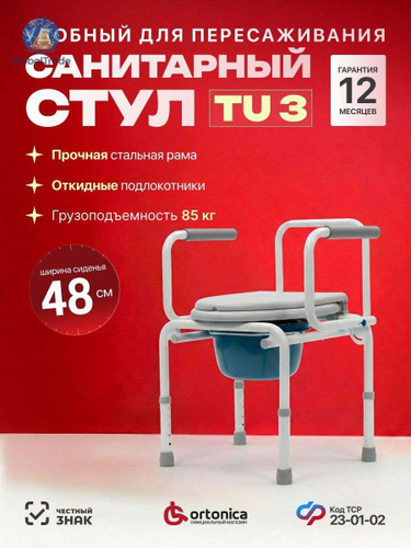 Ortonica TU 3 CH Кресло стул туалет для пожилых людей и инвалидов с санитарным оснащением с откидными подлокотниками регулируемый по высоте, до 85 кг