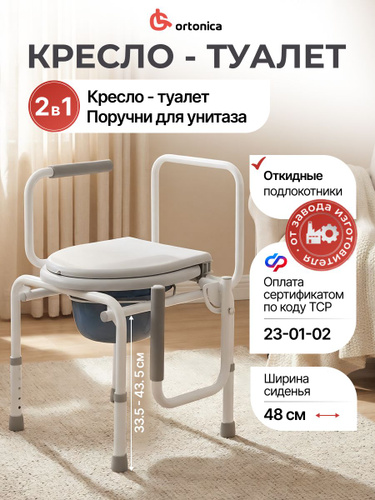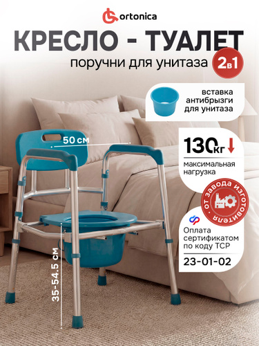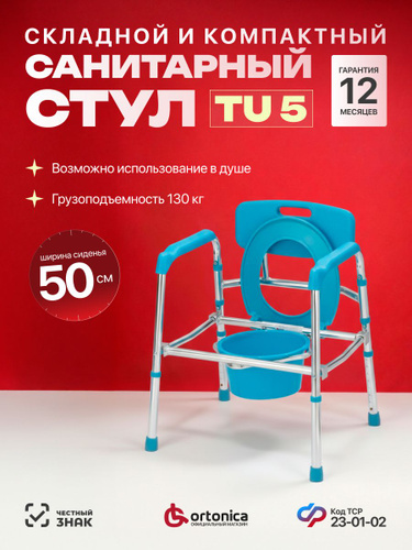 Ortonica TU 5 50 см (20") Кресло туалет складной для пожилых людей и инвалидов, санитарный стул на унитаз регулируемый по высоте, нагрузка до 130 кг, ширина сиденья 50 см