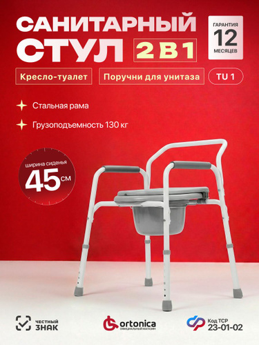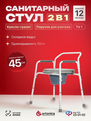 Ortonica TU 1 RU 45 см/ Кресло туалет для пожилых людей и инвалидов с санитарным оснащением, регулируемый по высоте, нагрузка до 130 кг, ширина сиденья 45 см