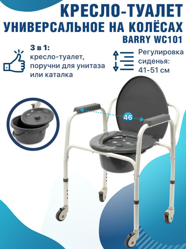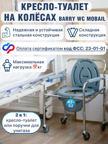 Кресло-туалет Barry WC Mobail с санитарным оснащением на колесах складной для взрослых, пожилых и инвалидов санитарный стул. Код ФСС 23-01-01