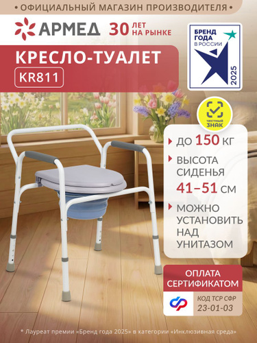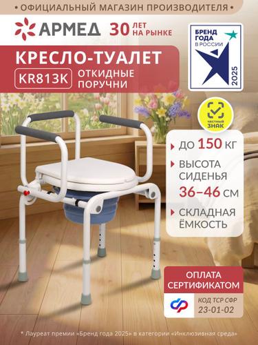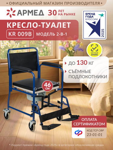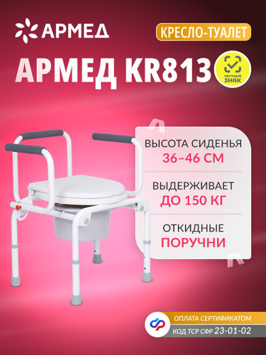 Кресло-туалет для инвалидов и пожилых Армед KR813K, стул с санитарным оснащением, мягкими подлокотниками, регулировкой высоты, переносное, можно исп-ть над унитазом, без колес по сертификату 23-01-02