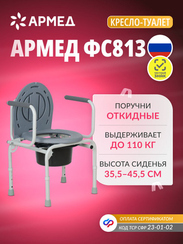 Кресло туалет для инвалидов и пожилых Армед ФС813 с откидными подлокотниками переносной для взрослых, больных, складной туалетный стул, медицинский с санитарным оснащением, по сертификату СФР 23-01-02