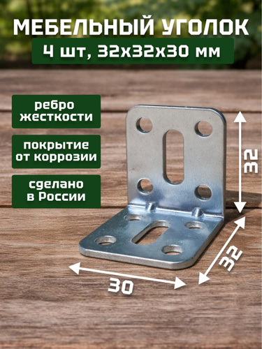 Уголок крепежный, кронштейн цинк регулируемый 32х32х30х2,0 мм (4 шт в упак). Мебельный крепежный уголок.Усиленный полкодержатель, держатель для полок