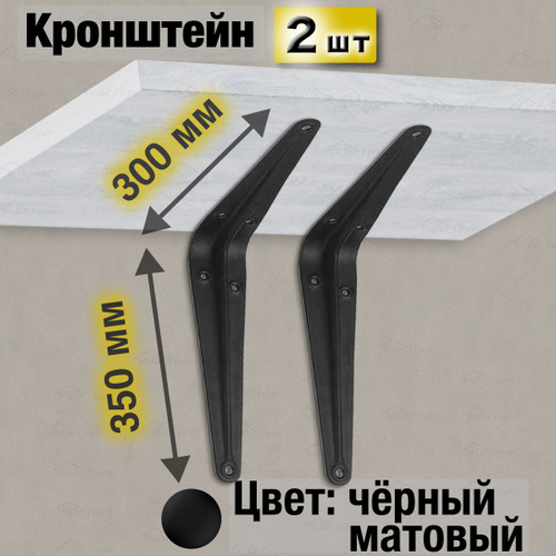 Кронштейн для полки металлический настенный усиленный угловой мебельный, полкодержатель, крепление на стену, держатель стеллажа, уголок, черный, 300 х 350 мм, 2 шт.