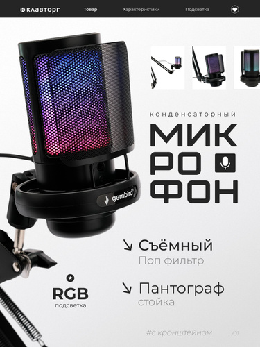 Микрофон конденсаторный Gembird M-02N, подсветка RGB, шумоподавление, микрофонная стойка (пантограф)