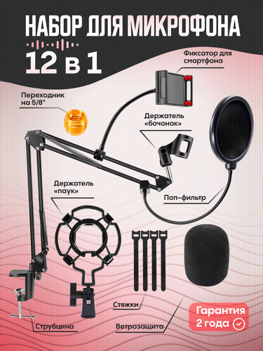 Стойка для микрофона настольная, пантограф с держателем паук, бочонок и креплением для смартфона, черная