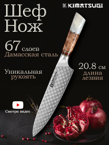 Kimatsugi / Японский кухонный Шеф-нож Damascus #143. Настоящая дамасская сталь 67 слоев. VG-10 в обкладках. Длина лезвия 20,8 см. В подарочной коробке