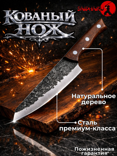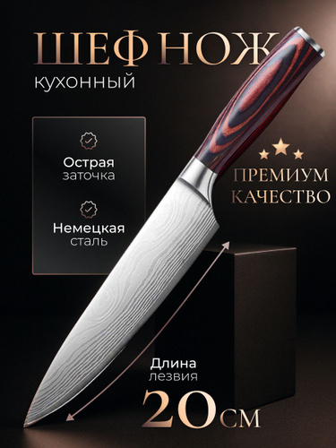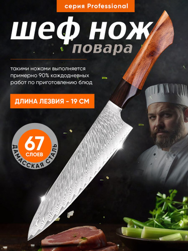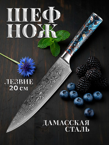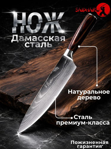 Нож кухонный Дамасский 20 см SAIDHARU Японский шеф-нож с деревянной ручкой универсальный