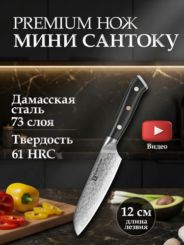 Kimatsugi / Японский кухонный нож Мини Сантоку Damascus в подарочном наборе. Настоящая дамасская сталь 73 слоя. VG-10 в обкладках. Длина лезвия 12 см