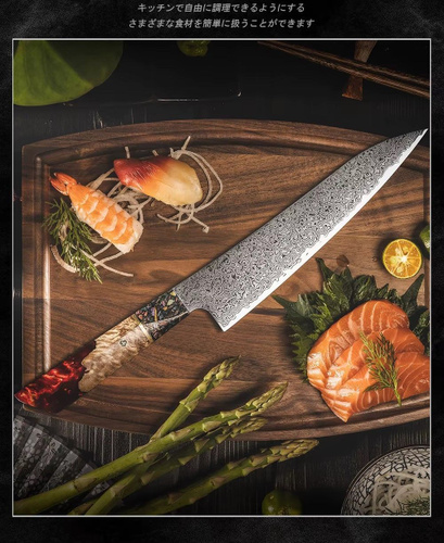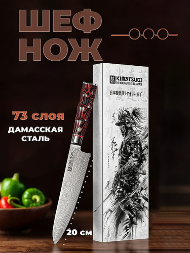 Kimatsugi / Японский кухонный Шеф-нож Damascus #104. Настоящая дамасская сталь 73 слоев. VG-10 в обкладках. Длина лезвия 210 мм. С пластиковыми ножнами. В подарочной коробке