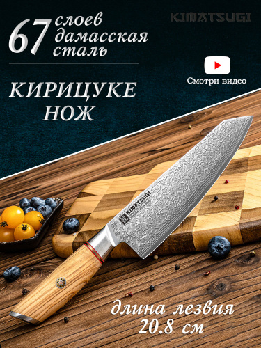 Kimatsugi / Японский кухонный нож Кирицуке Damascus #142. Настоящая дамасская сталь 67 слоев. VG-10 в обкладках. Длина лезвия 20,8 см. В подарочной коробке