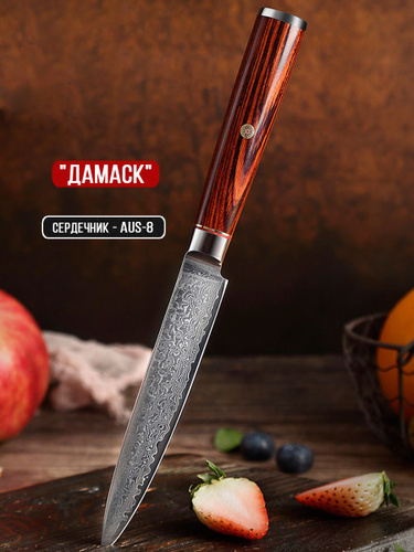 Нож кухонный дамасская сталь, универсальный AUS-8, коричневый, гладкий