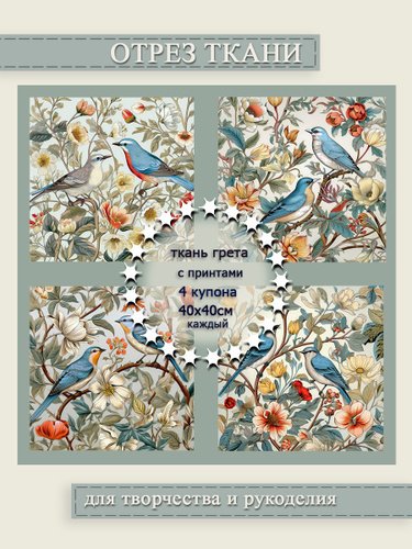 Отрез ткани для рукоделия, Птицы серо-голубые, 4 купона / набор для шитья/ необычный подарок