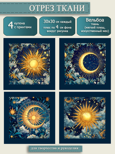 Ткань вельбоа/плюш Луна и Солнце, 4 купона 38х38см