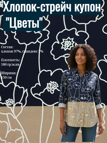 Ткань Хлопок-стрейч купон Цветы, т.синий+бежевый 1,5м