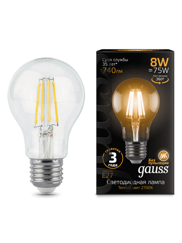 Лампочка филаментная E27 Gauss Filament А60 740лм 8Вт 2700К теплый свет, светодиодная