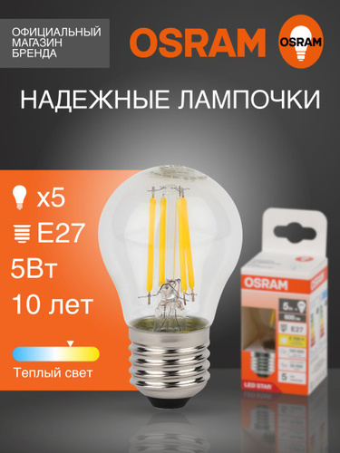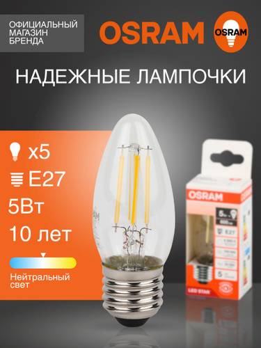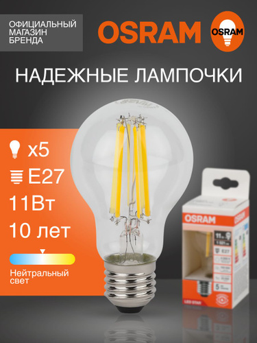 Лампочка светодиодная E27 филаментная OSRAM, груша, 11Вт, 4000К нейтральный белый свет, 5 шт