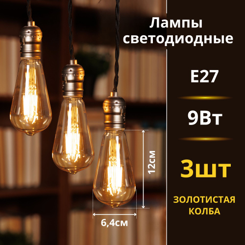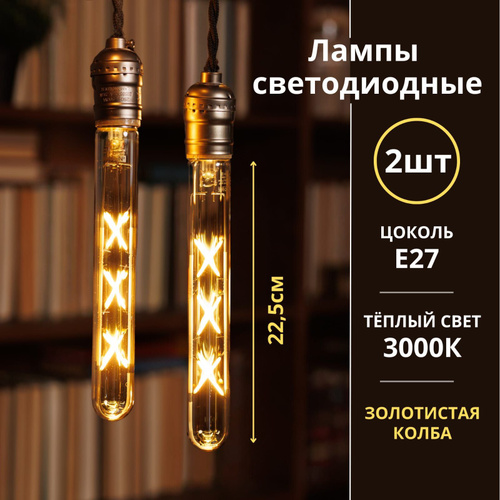 Лампочки светодиодные филаментные 2 шт 9Вт 230В Е27 3000К 1040Лм 225мм золотистые,LED декоративные , винтаж/ Лампа Эдисона