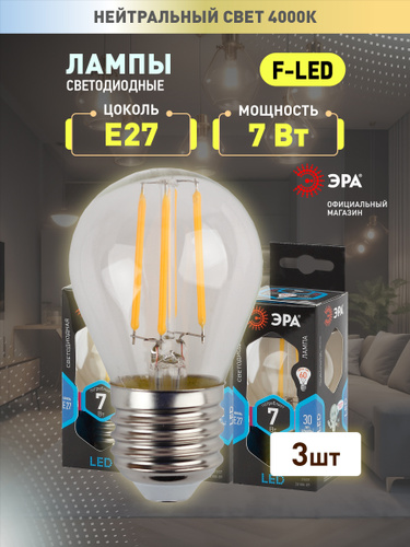 Лампочка светодиодная филаментная ЭРА LED E27 7 Вт P45 шар 4000К нейтральный белый свет набор 3 штуки