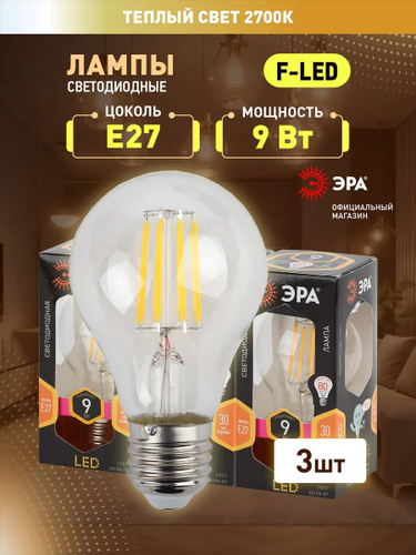 Лампочка светодиодная филаментная ЭРА LED Е27 9 Вт A60 груша 2700К теплый белый свет набор 3 штуки