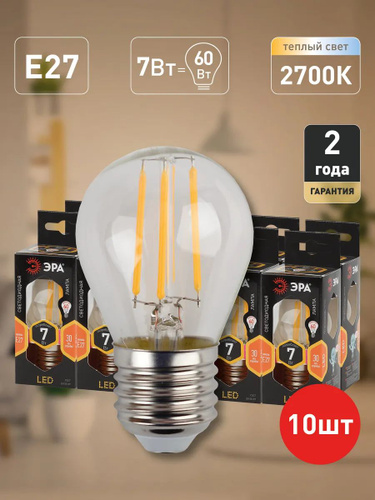 Лампочки филаментные светодиодные ЭРА LED Е27 7 Вт P45 шар 2700К теплый свет, набор 10шт