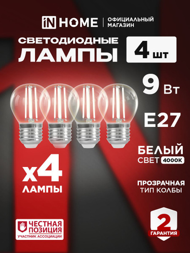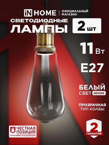 Лампочка светодиодная филаментная декоративная Е27 9W нейтральный белый свет 4000К 1140Лм прозрачная упаковка 2шт. IN HOME