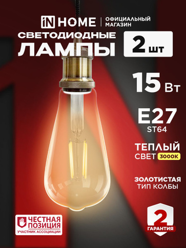 Лампочка светодиодная филаментная декоративная Е27 15W теплый свет 3000К 1570Лм золотистая упаковка 2шт. IN HOME