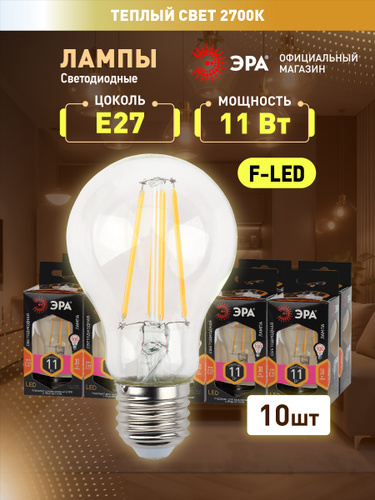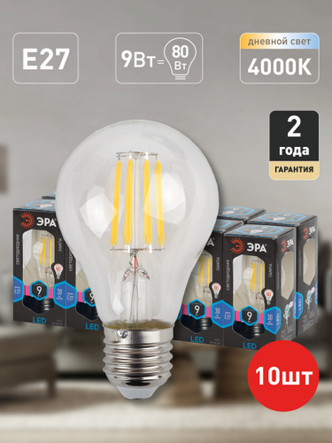 Лампочка светодиодная филаментная ЭРА LED E27 11 Вт A60 груша 4000К нейтральный белый свет набор 10 штук