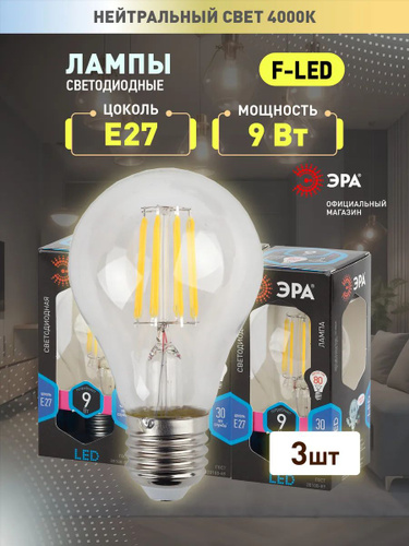 Лампочка светодиодная филаментная ЭРА LED Е27 9 Вт A60 груша 4000К нейтральный белый свет набор 3 штуки