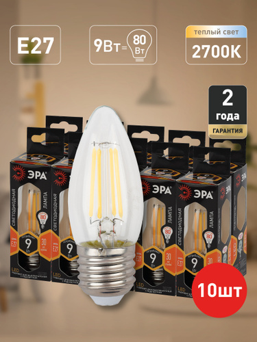 Лампочка светодиодная филаментная ЭРА LED Е27 9Вт P45 шар 2700К теплый белый свет набор 10 штук