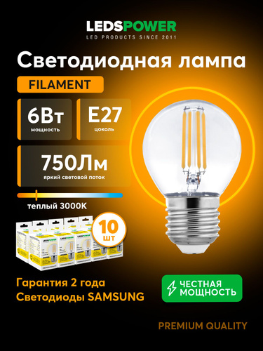 Лампочка светодиодная филаментная G45 6 Вт, 3000К в форме шара с теплым белым светом с цоколем Е27, LEDS POWER, Упаковка 10 шт. Артикул 007113