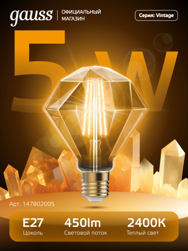 Лампочка светодиодная 5W 450lm 2400К Е27 golden Diamond LED Gauss Filament