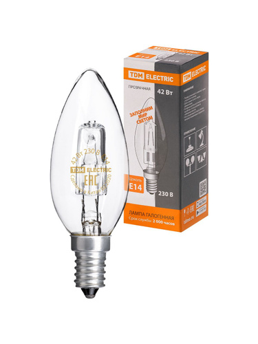 Лампа галогенная "Свеча" прозрачная 42 Вт-230 В-Е14 TDM