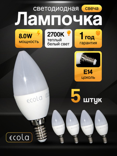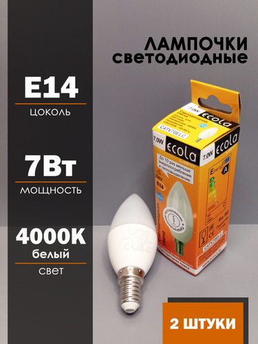 2 шт. Лампочка светодиодная Е14 7Вт 4000K свеча Ecola LED для люстры