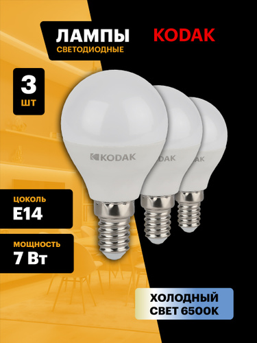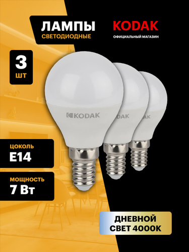 Лампочка светодиодная KODAK LED Е14 7 Вт P45 шар 4000К нейтральный белый свет набор 3 штуки