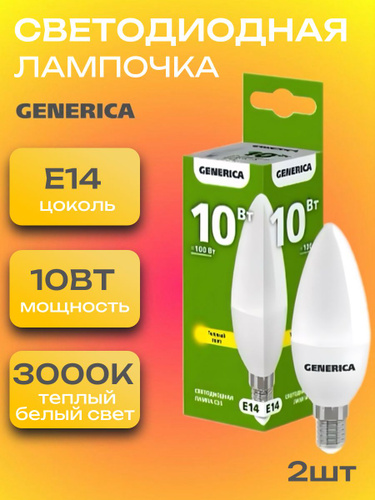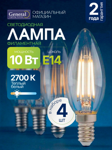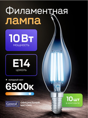 Лампочка светодиодная филаментная E14 10 Вт, CWS (свеча на ветру), 6500К холодный свет, General, 10 штук