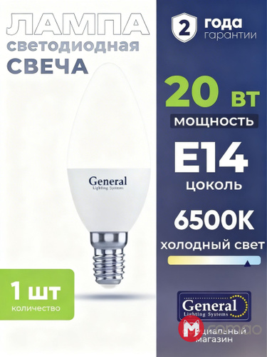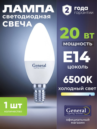 Лампочка светодиодная E14 20 Вт General, холодный белый свет 6500K матовая свеча, 1 штука