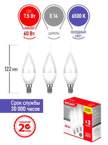 Лампочка светодиодная REXANT LED E14 7,5 Вт CW свеча на ветру 6500К холодный белый свет набор 3 штуки энергосберегающая