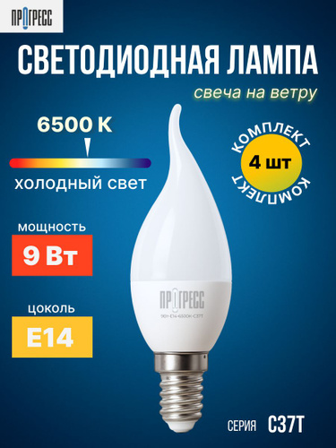 Светодиодная лампа ПРОГРЕСС STANDARD свеча на ветру, цоколь Е14, 9 Вт., 6500К (холодный свет), 4шт.