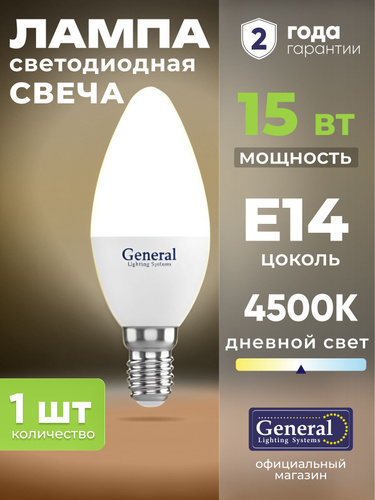 Лампочка светодиодная E14 15 Вт General, холодный белый свет 6500K матовая свеча, 1 штука