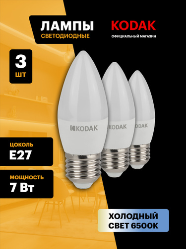 Лампочка светодиодная KODAK LED Е14 7 Вт B35 свеча 6500К холодный белый свет набор 3 штуки