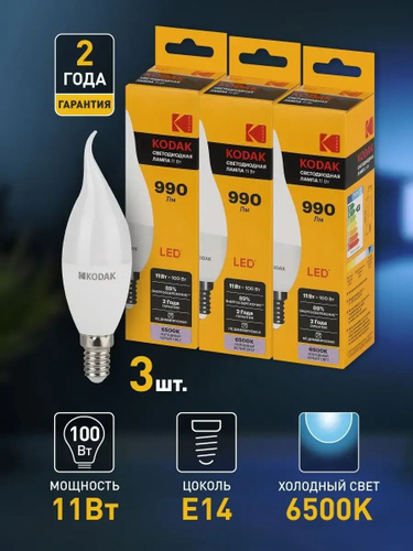 Лампочки Kodak LED KODAK BXS-11W-865-E14 E14 свеча на ветру / Электролампы светодиодные Е14 11Вт холодный дневной свет набор из 3 штук