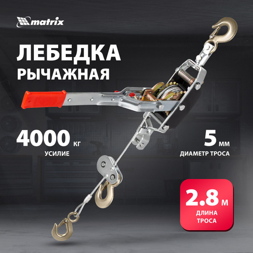 Лебедка ручная рычажная MATRIX, 4 т тяга и 1.6 т подъем, двойное храповое колесо и стопорный механизм, стальной трос диаметром 6 мм и карабины на крюках, лебедка автомобильная, 52225