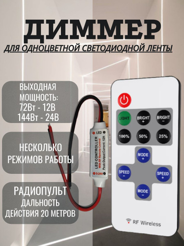 Диммер-контроллер мини, с радиопультом для управления одноцветной монохромной светодиодной лентой, 12-24В