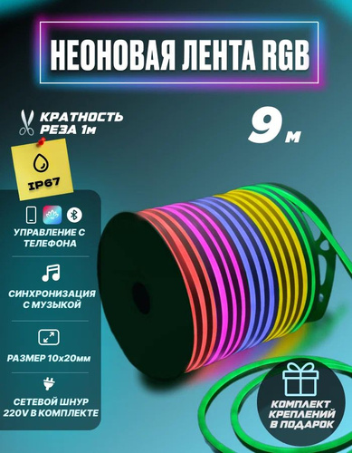 Неоновая светодиодная лента RGB 10 метров, 24 v c Bluetooth и креплениями, гибкий неон, подсветка в комнату с пультом