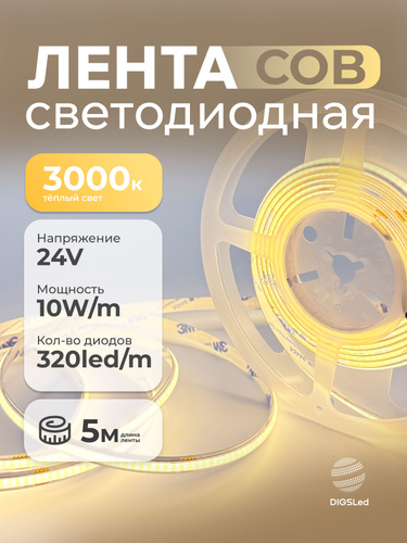 Светодиодная лента COB 24В,10Вт, 5м, Теплый свет 3000К, DIGSLED Normal-C COB 320led 24V Warm White 10W