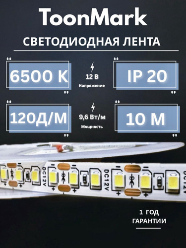 Светодиодная лента 10 м; 12v; 9.6 Вт/м; 6500К холодный cвет